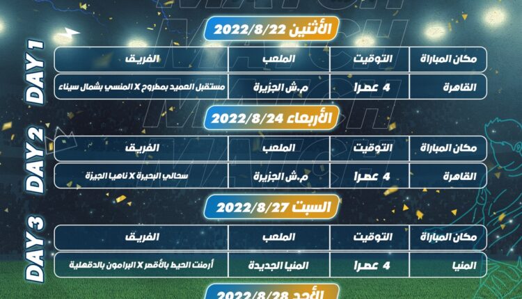 تبدأ أولى مباريات دور الـ 8 اليوم بين مركزيْ شباب مستقبل العميد بمرسى مطروح والمنسي بشمال سيناء، تليها مباراة سحالي البحيرة وناهيا الجيزة يوم الأربعاء من نفس الأسبوع بملاعب مركز شباب الجزيرة، ثم مباراة أرمنت الحيط بالأقصر والبرامون بالدقهلية يوم السبت 27 أغسطس والعمراوي بالإسكندرية والخارجة بالوادي الجديد بملاعب المنيا الجديدة.