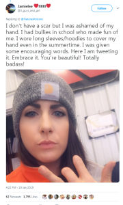 وكان من ضمن المشاركين فى التعليقات، فتاة تدعى “جميلى”، التى نشرت صورة لاصابتها المتمثلة فى بتر أحد أصابعها، وكتبت “ليس لدى ندبة بسيطة مثلك ولكنى لدى إصابة أكبر بكثير وهى بتر أحد أصابعى، وكنت أخجل من أصدقائى فى المدرسة بسببها حتى تخطيت تلك المرحلة بسبب بعض الكلمات المشجعة.. أنتى جميلة”، فيما جاء بين الصور المشجعة للفتاة، صور لفتيات فى مثل سنها أصيبوا بنفس الجرح فى مؤخرة الرأس، أو فى القدم واليد، وكانت الرسومات طريفة جدًا، فمنهن من رسم “جرار” وكأن الجرح “سوستة” ملابس، فيما رسمت فتاة رأس وذيل سمكة فى بداية ونهاية الجرح الذى بدا وكأنه أشواك السمك.