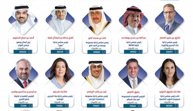إبراهيم بن محمد زينل رئيس مجلس إدارة مجموعة ترافكو عدد الأصوات: 92304، طارق بن جليل الصفار رئيس مجلس إدارة بنك البحرين والكويت عدد الأصوات: 92097، عبدالله بن حسن بوهندي رئيس مجلس إدارة شركة BMMI عدد الأصوات: 91902، خالد بن محمد كانو رئيس مجلس إدارة مجموعة يوسف بن أحمد كانو عدد الأصوات: 89880، الشيخ عبدالله بن خليفة آل خليفة رئيس مجلس إدارة “بيون” عدد الأصوات: 88739، أحمد بن صباح السلوم رجل أعمال وعضو مجلس النواب عدد الأصوات: 88660، هلا بنت فاروق المؤيد نائب رئيس مجلس إدارة مجموعة المؤيد العالمية عدد الأصوات: 80169.