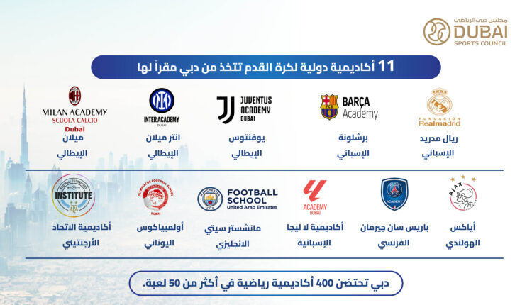 وارتفع عدد أكاديميات كرة القدم الدولية التي تحتضنها دبي ليصل عددها إلى 11 أكاديمية دولية اتخذت من دبي مقرًا لها من بين 400 أكاديمية رياضية تنتشر في كافة أرجاء دبي وتمارس نشاطها التدريبي لاكتشاف وتطوير المواهب الرياضية الشابة في أكثر من 50 لعبة رياضية متنوعة وبمشاركة واسعة من مختلف المراحل العمرية وجميع الجنسيات.