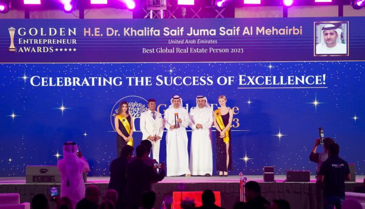 H.E. Dr. Khalifa Saif Al Mehairbi expressed his joy at receiving the Golden Entrepreneur Award for the Best Global Real Estate Person and the Best Real Estate Investment Company 2023. These accolades crown his extensive career in the real estate sector and his success in achieving significant milestones that have contributed to the development of the sector, both in the United Arab Emirates and internationally.