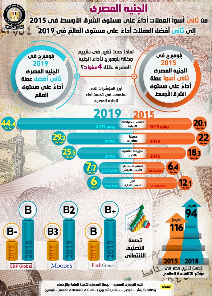 وفي نفس سياق استعراض أسباب تغير تقييم بلومبرج لأداء الجنيه, فقد جاء أيضاً في الإنفوجراف, أن أحد أهم تلك الأسباب أن التصنيف الائتماني لمصر قد تحسن, حيث رفعت مؤسسة “فيتش”, تصنيف مصر الائتماني من (B) عام 2015 إلى (B+) عام 2019, كما رفعت مؤسسة “موديز” أيضاً التصنيف الائتماني لمصر من (B3) عام 2015 إلى (B2) عام 2019، فضلاً عن رفع مؤسسة “ستاندر أند بورز” التصنيف الائتماني لمصر من ( B-) عام 2015 إلى (B) عام 2018, وأخيراً, تحسن ترتيب مصر في مؤشر التنافسية العالمي, لتحتل المركز الـ 94 عام 2018، مقارنة بالمركز 116 عام 2015.